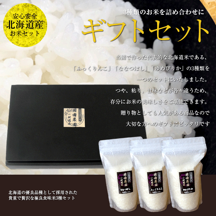 当園で作られている北海道米のなかでも、味と食感のバランスがよい3種類のお米を詰合せにしたギフトセットです。